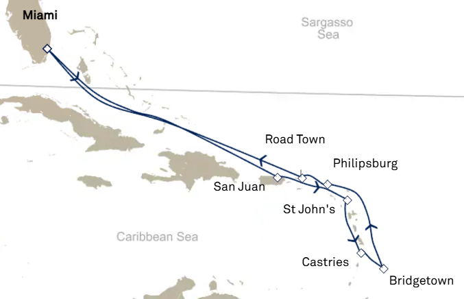 This sun-soaked Cunard Line Caribbean voyage roundtrip from Miami blends tropical beauty with timeless elegance at sea. After relaxing days crossing warm Atlantic waters, guests explore the colorful streets of San Juan, the beaches of St. John's, the lush landscapes of Castries, and the vibrant culture of Bridgetown. The journey continues to Philipsburg and Road Town, offering pristine beaches and crystal-clear waters before returning to Florida. Combining refined service, classic ocean travel, and idyllic island escapes, this sailing delivers the perfect balance of relaxation and discovery.