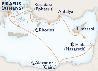 Cruise to ancient cities on the Mediterranean Sea, staying overnight in vibrant Haifa (Tel Aviv). Marvel at Cyprus’ Limassol Castle, Antalya’s Old City, Ephesus’ ruins and more.