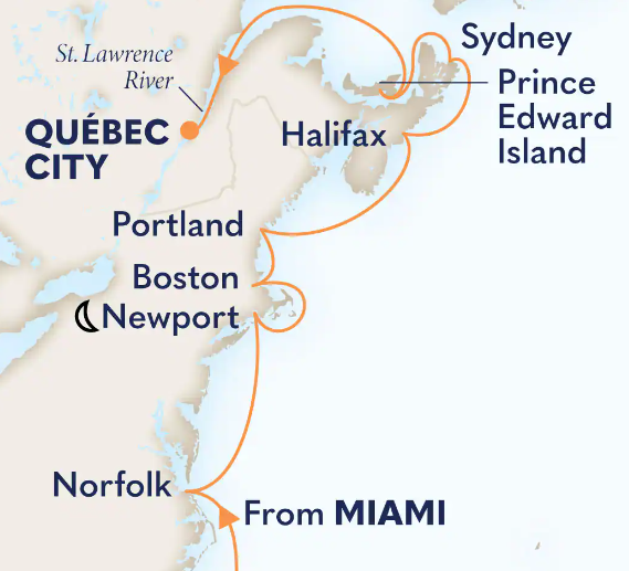 This 14-night Holland America Line cruise is a scenic journey from Miami to Québec City, blending relaxing days at sea with some of the most charming ports along the U.S. East Coast and Atlantic Canada. From historic cities like Norfolk, Boston, and Newport to the coastal beauty of Maine, Nova Scotia, and Prince Edward Island, the itinerary builds toward breathtaking cruising through the Gulf of St. Lawrence and the Saint Lawrence River. The voyage concludes in the heart of Old Québec, offering a memorable finish rich in history, culture, and natural beauty.