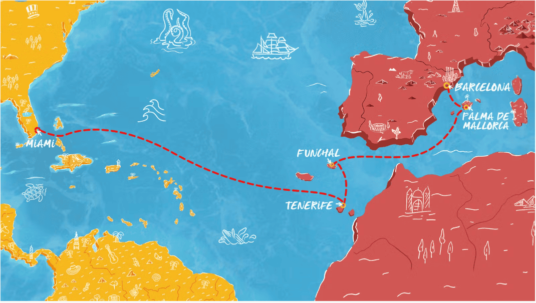 This 14-night Spain to Miami Halloween Transatlantic departs Barcelona and stops in Palma de Mallorca before two expansive days at sea. The journey continues to Funchal and Santa Cruz de Tenerife, followed by eight uninterrupted sea days designed for full ship immersion, indulgent pacing, and true ocean-crossing romance before arriving in Miami for a one-of-a-kind Halloween escape.