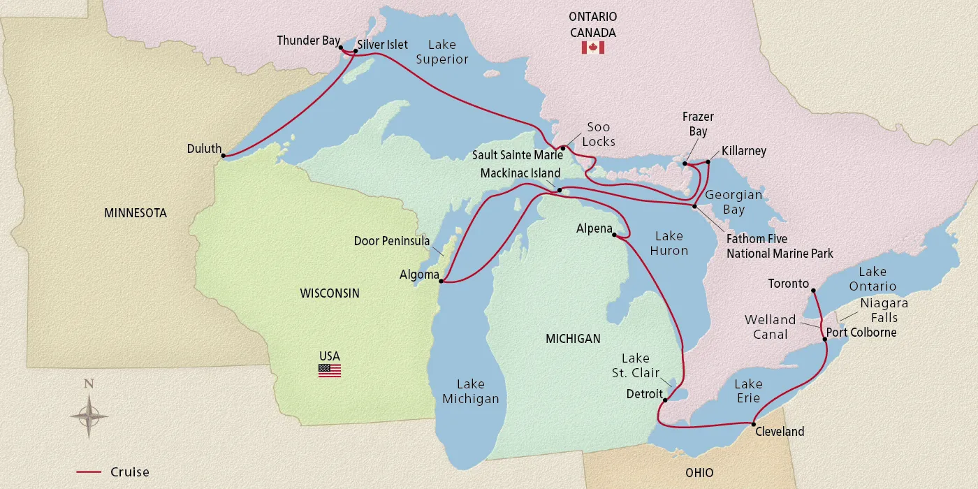 Set sail on a voyage across the historic waterways of all five of the majestic Great Lakes. Discover scenic shorelines, explore storied cities and view the awesome power of the thundering Niagara Falls. Navigate the granite islands and sheltered inlets of Georgian Bay and traverse the famous Soo Locks. As you journey, study the aquatic ecosystems of the lakes and venture into the dense boreal forests that line the shores of Lake Superior and Lake Michigan.