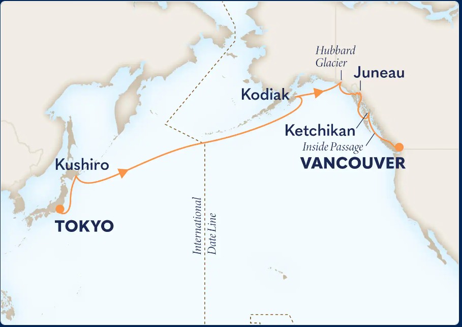 This transpacific cruise showcases wildlife and pristine nature, from the delicate cranes in Kushiro’s wetlands to Kodiak Island’s massive bears to scenic cruising Hubbard Glacier.