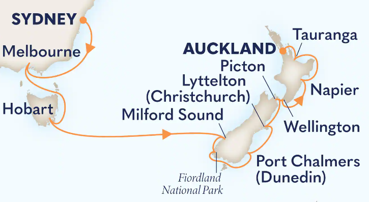 This scenic Princess cruise begins in Sydney and explores the stunning coastlines of southern Australia, including Melbourne and Hobart, before crossing the Tasman Sea to New Zealand. Highlights include breathtaking cruising through Fiordland National Park and Milford Sound, followed by immersive port visits in Dunedin, Christchurch, Wellington, Napier, Tauranga, and Auckland. This voyage blends dramatic natural landscapes with vibrant cultural cities for an unforgettable Australasian adventure.