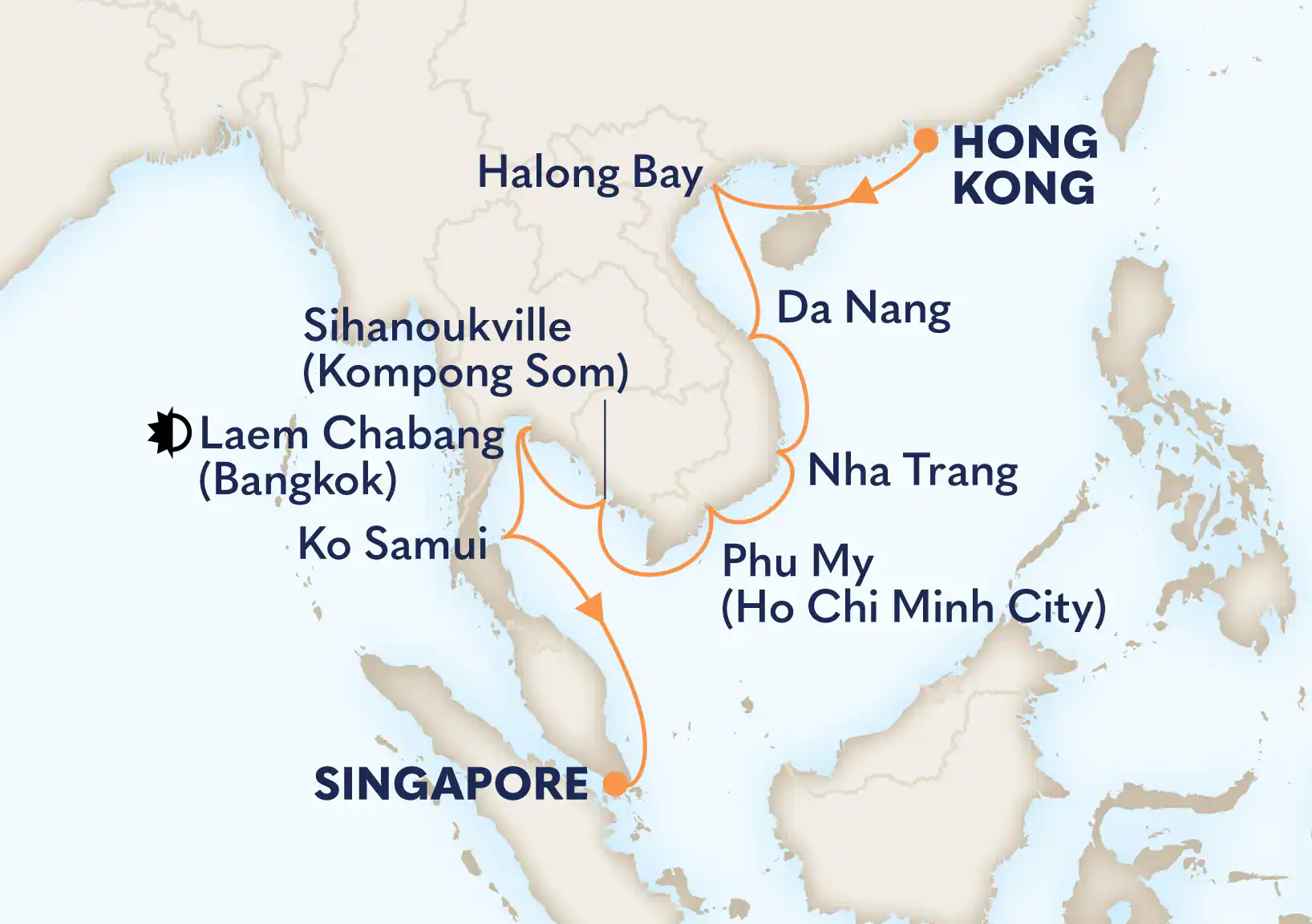 Sail through Southeast Asia on an unforgettable journey starting in vibrant Hong Kong and ending in dazzling Singapore. This immersive itinerary blends relaxing days at sea with culturally rich ports across Vietnam, Cambodia, and Thailand. Explore the limestone wonders of Halong Bay, the historic charm of Hue from Da Nang, and the coastal beauty of Nha Trang before heading to bustling Ho Chi Minh City via Phu My. Continue to Cambodia’s Sihanoukville, then enjoy an overnight stay near Bangkok, followed by a tropical escape to Koh Samui. With a perfect mix of scenic cruising and in-depth exploration, this voyage offers an incredible taste of the region’s diversity, history, and natural beauty.