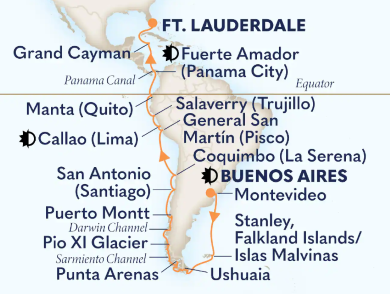 Marvel at wonders from Buenos Aires’ lively streets to Chile’s glaciers, Peru’s Incan ruins to the astonishing Panama Canal. Stay overnight in Argentina, Peru and Panama.