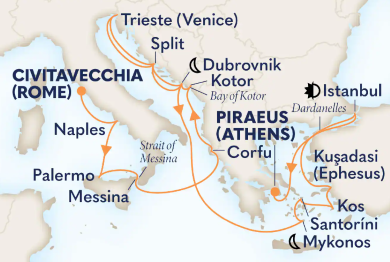This Holland America cruise embarks from Rome and sails through the Mediterranean, visiting iconic Italian ports including Naples, Palermo, and Messina. Guests then explore the beauty of Greece with stops in Corfu, Santorini, Mykonos, Kos, and the historic Piraeus (Athens), while also experiencing the stunning Adriatic coast with Kotor, Dubrovnik, and Split. The journey includes scenic cruising through the Strait of Messina, Bay of Kotor, and the Dardanelles, offering breathtaking views, cultural landmarks, and a rich blend of history and seaside charm across multiple countries.