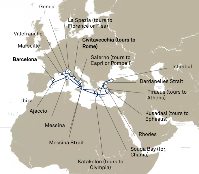 Experience an extraordinary Cunard voyage through the heart of the Mediterranean and the Aegean, beginning in Barcelona and sailing through some of Europe’s most iconic destinations. Discover the vibrant charm of Ibiza, the historic beauty of Corsica, and the stunning coasts of Italy before exploring the rich culture of Greece and Turkey, including an overnight stay in Istanbul. With scenic cruising through legendary waterways such as the Messina Strait and the Dardanelles, and visits to timeless cities like Rome, Athens, and Florence, this remarkable journey blends history, culture, and breathtaking coastal landscapes