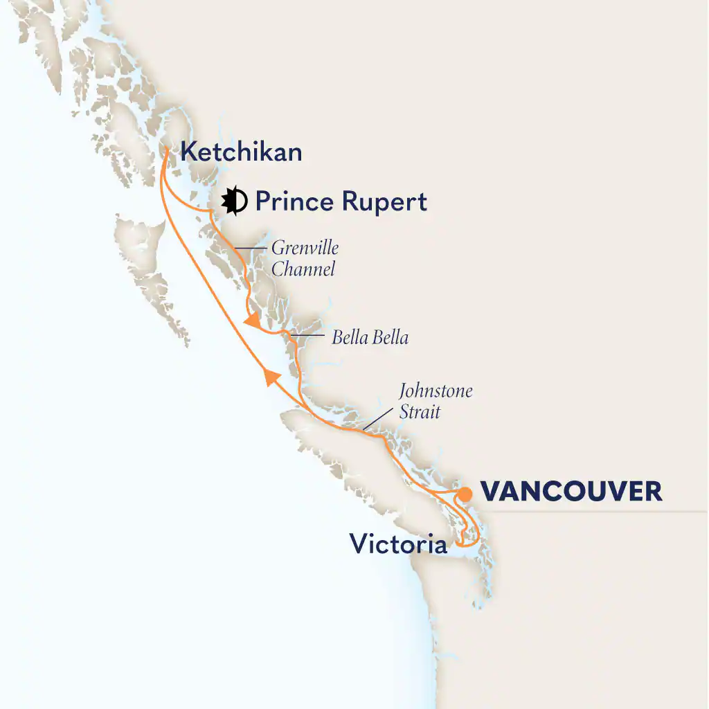 Explore British Columbia’s untamed coastline, a vast temperate rainforest that is home to rare white spirit bears. Visit Nanaimo, Victoria, and stay overnight in Prince Rupert.