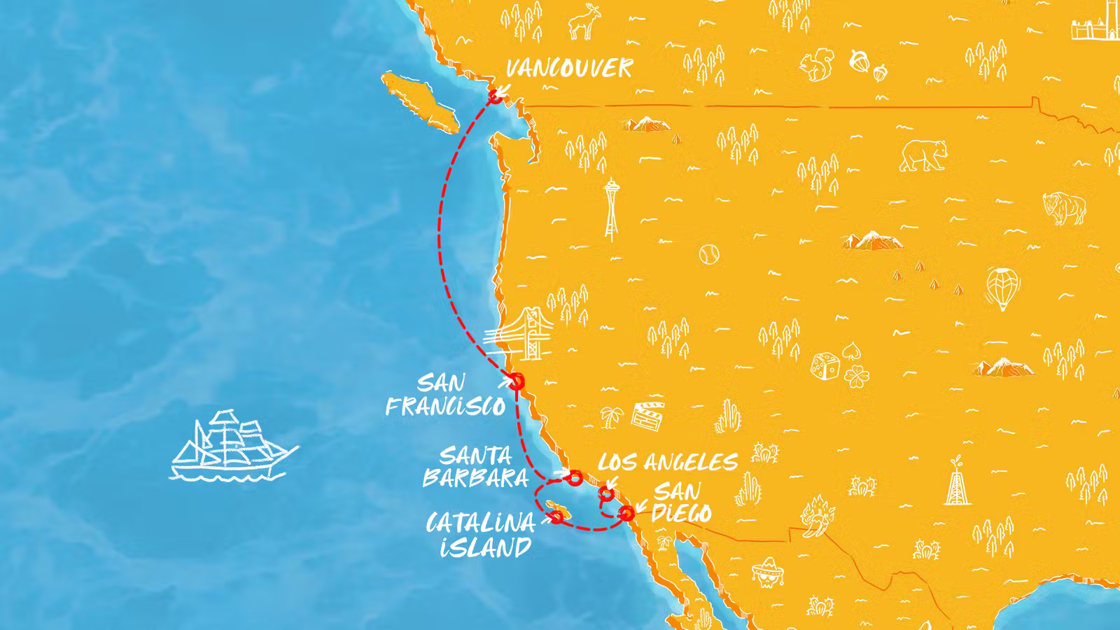 This 8-night voyage departs from Vancouver, British Columbia late in the evening affording you the opportunity to explore this storied city. You'll spend a day sailing to San Francisco followed by one more sailing to Santa Barbara, an oasis of outdoor fun. Next, you’ll dock in Catalina Island followed by San Diego before arriving at your final destination, Los Angeles.