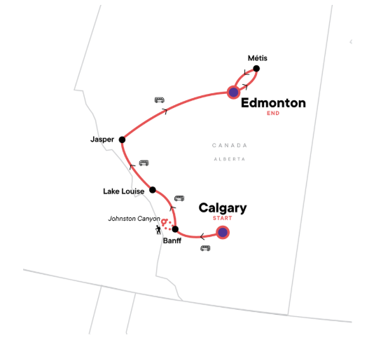 Winter in the Canadian Rockies hits different — the air’s crisper, the mountains feel bigger, and everything slows down under a thick, magical blanket of snow. On this nine-day adventure, you’ll explore the iconic landscapes of Banff, Lake Louise, and Jasper, then dive deeper into local culture at Alberta’s first and only Métis cultural interpretive centre. Spot wildlife, learn the stories and traditions of the Métis, and watch the sky for a chance to see the Northern Lights. From snowshoeing through powdery meadows to cruising the legendary Icefields Parkway, this is winter in its purest form — wild, beautiful, uncrowded, and full of meaning.