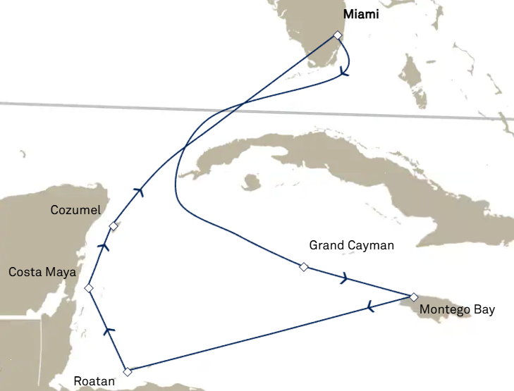 This Caribbean cruise offers a perfect mix of laid-back sea days and vibrant port adventures, sailing round-trip from Miami to some of the region’s most popular destinations. Guests will enjoy tropical stops in Grand Cayman, Montego Bay, Roatán, Costa Maya, and Cozumel, with plenty of time ashore to explore beaches, culture, and local cuisine. Relaxing days at sea round out the journey, making this an easygoing and well-balanced getaway in the Western Caribbean.